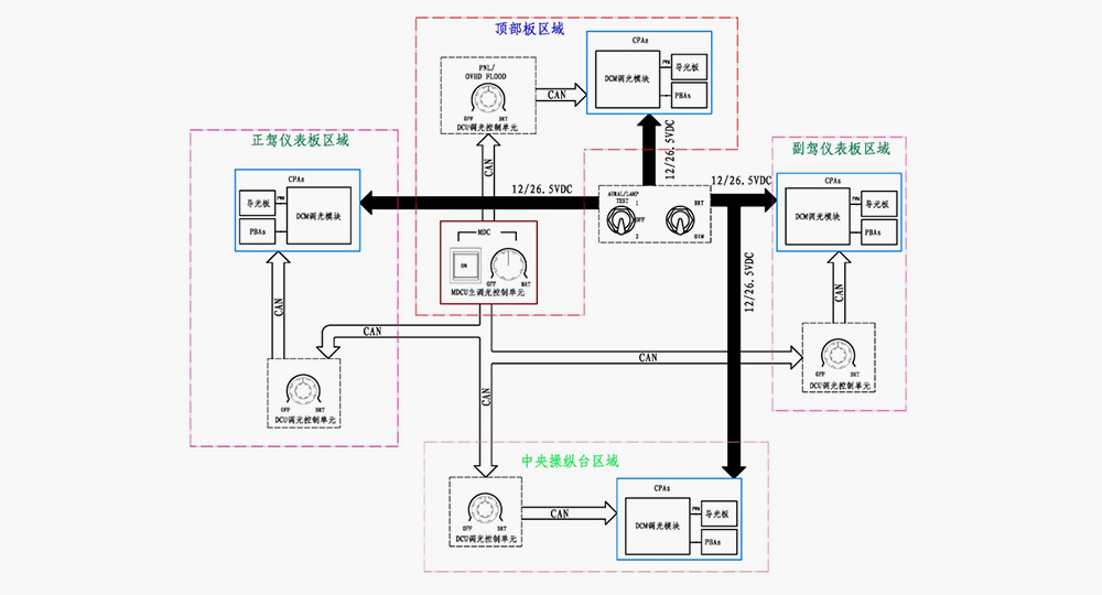 調(diào)光控制系統(tǒng)具有自動和手動調(diào)光功能,分為“白天/夜晚”兩種工作狀態(tài),以及“夜視/正常/雷暴”三種工作模式。 其工作原理主要是在自動狀態(tài)下通過區(qū)域調(diào)光控制板采集光傳感器信號、采集“夜視正常雷暴”模式選擇開關(guān)信號及“白天夜晚”狀態(tài)信號經(jīng)過處理器板處理后形成數(shù)據(jù)包,通過數(shù)據(jù)總線分別發(fā)送到電源控制組件,由電源控制組件處理器板解析后輸出調(diào)光控制信號,控制主照明系統(tǒng)的亮度。