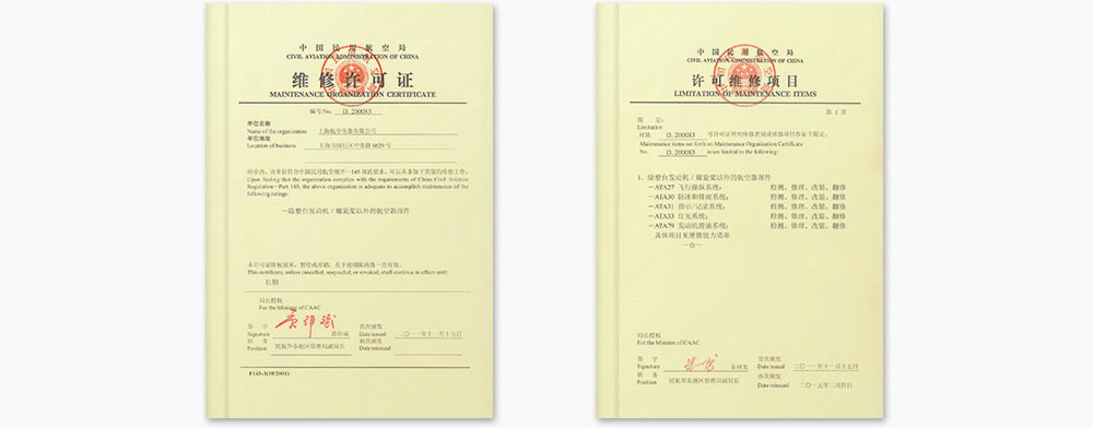 We are certified with ‘Maintenance License’ by East China Administration of Civil Aviation on November, 15th, 2011. (Registered No:200083)