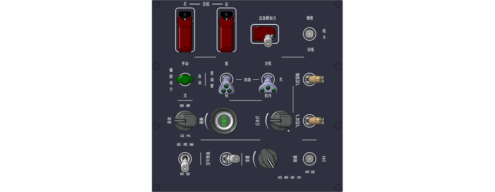 模擬式控制板由多種具有形狀和顏色編碼的開關(guān)、旋鈕、保護(hù)蓋等組成。控制板為飛行員的操作提供視覺和觸覺反饋,顯著提高了飛行員操作的準(zhǔn)確性、快捷性。操作飛機(jī)上重要設(shè)備的器件配備保護(hù)蓋,防止誤操作。